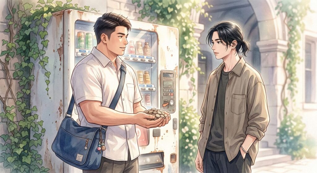 夕暮れの大学構内。時代物のような古い飲料自動販売機の前。林太郎は、自身のシャツの裾を両手で持ち上げ、前掛けのようにして何かを抱え込んでいる。そこへ義道がやってくる。