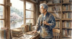 古書店を営む村の「生き字引」であり、精神的支柱です。失われた風景や物語を守る「静」の守護者で、古書の引用を通じて人々に本質を指し示します。穏やかな佇まいながら、かつて「忍者」と評された俊敏な身のこなしは健在です。趣味は古文書蒐集。法的手続きやデジタル事務も完璧にこなすリアリストでもあり、2階の窓から村の営みを静かに見守る、賢者にして観察者としての役割を担っています。
