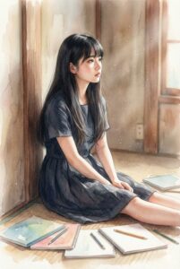 性格・外見の特徴:人形のように整った端正な顔立ちが印象的な少女です。腰まで届く艶やかな黒髪と、すべてを見透かすような冷徹で深い瞳を持っています。ここあん高校にはあまり通わず、アパートの一室で静かに創作活動に励む早熟の作家です。住人たちの会話を影から観察し、大人たちの嘘や欺瞞を鋭く見抜く沈黙の観測者としての顔も持っています。感情を表に出すことは少ないですが、その内側に秘めた創作への情熱と類稀な才能は、母である留美子さえも驚嘆させるほど圧倒的です。