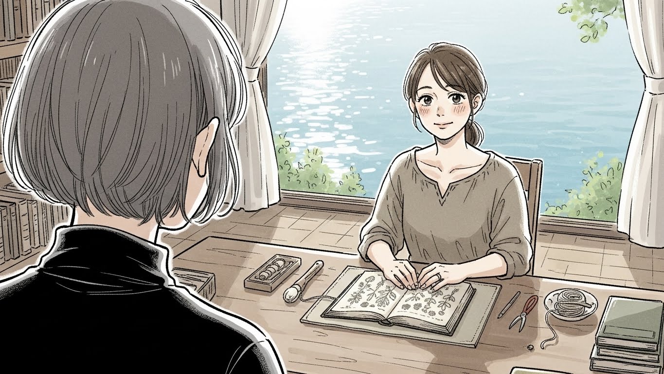 中野小春が、古本の補修をしていた。テーブルの上には、明治期に刊行された植物図鑑が開かれている。色褪せた銅版画の横で、緩んでしまった糸綴じを、彼女は一本の長い針を使い、新しい麻糸で丁寧に縫い直していた。それは、彼女にとって、珈琲を淹れることと同じくらい、世界の秩序を回復させるための、静かな営みだった。その指先は、失われた時を元に戻すのではなく、傷ごと、新しい時間へと繋ぎ合わせようとしているかのようだった。