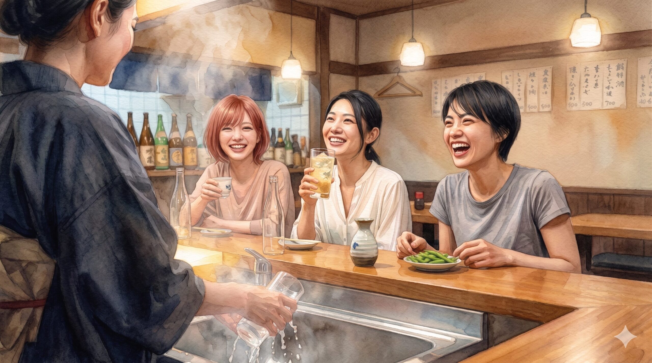 ここあん村の金曜の夜は、いつもより少しだけ浮かれた空気が広がる。居酒屋「ここきた」のカウンターも、仕事帰りの人々や、週末を前に一杯ひっかけようという客で賑わいを見せていた。そんな喧騒の中、偶然隣り合わせた三人の女性がいた。おはぎはん、南花おちば、そして真田まるである。