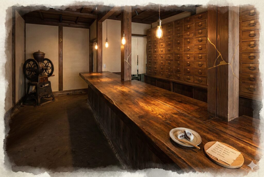 店内には、叩きの土間が広がり、外界の喧騒を遮断する。壁一面に並んだ薬棚のような小さな引き出しには、かつての客たちが置いていった「物語の断片」が眠っている。